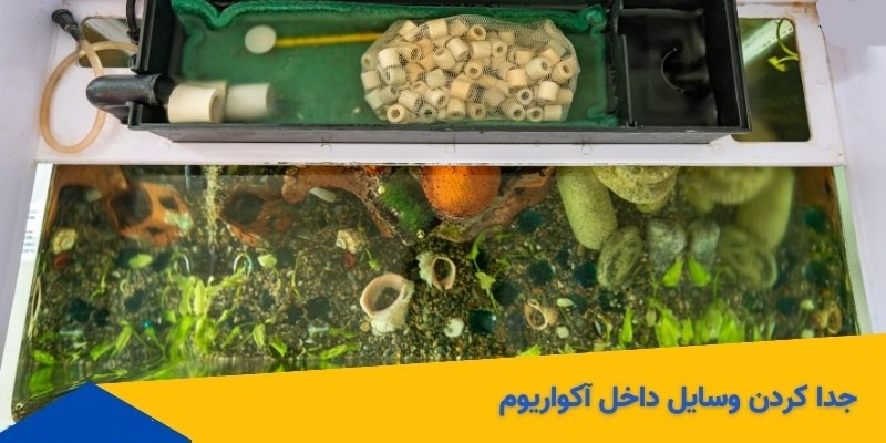 وقتی که وسایل داخل آکواریوم برمیدارید، باید با دقت و مراعات اقدام به جدا کردن و مونتاژ مجدد آنها کنید، تا زیبایی و تعادل محیط آکواریوم حفظ شود. تجهیزات مانند فیلترها، پمپها، سنگ ها، وسایل داخل آکواریوم و تزئینات دیگر نیز باید با دقت جابجا شوند. حتما از دستکشهای پلاستیکی برای جلوگیری از انتقال مواد آلوده به وسایل استفاده کنید. برای جلوگیری از خرابی و آسیب به تجهیزات، آنها را به دقت از داخل آکواریوم خارج کرده و با وسایل مناسب بسته بندی نموده و در کارتن های مقاوم برای حمل قرار دهید.